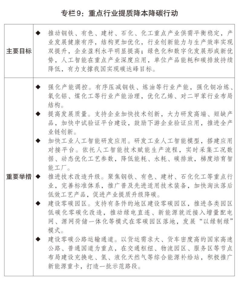 一是积极稳妥推进碳达峰。全面实施碳排放双控制度,制定实施碳达峰碳中和综合评价考核办法和更高水平更高质量做好节能降碳工作的意见,扎实开展“十五五”碳达峰行动,建立可再生能源消费最低比重目标制度。坚决遏制高耗能高排放项目盲目发展,严格实施固定资产投资项目节能审查和碳排放评价,对新上高耗能高排放工业项目实施碳排放等量或减量置换。深入推进重点行业节能降碳改造,依法依规淘汰落后产能。制定能源强国建设规划纲要,加快新型能源体系建设,有序推进“沙戈荒”新能源、西南“水风光”清洁能源和采煤沉陷区新能源基地建设,加快推进跨省清洁能源输电通道规划建设,因地制宜发展分布式能源,积极发展抽水蓄能、新型储能,加快智能电网建设。推动煤炭消费清洁替代,开展煤电和煤化工低碳化改造,推动现代煤化工与绿氢、生物质等新能源耦合发展,加快淘汰落后燃煤设施设备。推进零碳园区和零碳工厂建设,推进氢能综合应用,启动零碳公路运输通道示范路段建设。制修订一批能耗强制性标准和碳排放管理相关标准,强化行业、企业、项目、产品碳排放管理支撑。完善碳排放统计核算、碳足迹管理体系,建立绿色贸易进出口统计制度和监测体系。进一步扩大碳排放权交易市场覆盖范围,完善全国温室气体自愿减排交易市场制度体系。