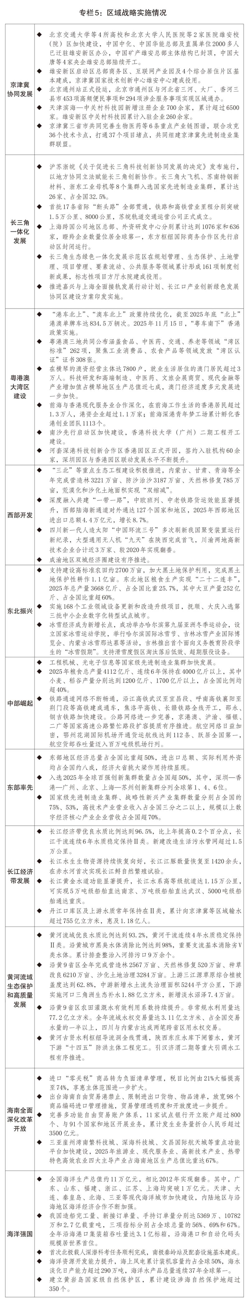 2025年是“十四五”收官之年。过去5年,以习近平同志为核心的党中央团结带领全党全国各族人民迎难而上、砥砺前行,经受住世纪疫情严重冲击,有效应对一系列重大风险挑战,“十四五”规划主要目标任务胜利完成,经济社会发展取得一系列具有开创性、突破性、标志性的重大成就。经济发展实现历史性跨越。2025年经济总量比2020年增长超过35%,对世界经济增长贡献保持在30%左右;制造业增加值比2020年增长31%,规模连续16年全球第一;国家综合立体交通网主骨架建成率超过90%;制造业投资实现7.7%的年均增长;常住人口城镇化率比2020年末提高4个百分点。创新驱动取得重大突破。全社会研发经费投入总量达到3.9万亿元,一批关键核心技术攻关实现突破,第一艘国产电磁弹射航母福建舰下水,全球第一座第四代核电站石岛湾基地投入商业运行,国产大飞机C919第一次实现商业运营,若干“国之重器”站上创新制高点;科技创新推动产业加快升级,技术合同成交额约为2020年的2.67倍,集成电路成为单一商品出口第一,工业机器人、无人机等产量位居世界首位。民生保障扎实有力。城乡居民收入比由2020年的2.56缩小至2.31;基本公共服务水平明显提升,城乡居民全国基础养老金最低标准、基本医疗保险人均财政补助标准分别比2020年提高53.8%、27.3%,劳动年龄人口平均受教育年限、人均预期寿命比2020年分别增加0.5年、1年以上。绿色发展底色更加鲜明。“增绿”全球最多,森林覆盖率超过25%,新增森林面积贡献全球新增绿化面积约25%;“治污”成效显著,地级及以上城市空气质量优良天数比例比2020年提高2.3个百分点,长江、黄河干流全线连续多年保持在Ⅱ类水质标准;“用能”更加清洁,新能源发电装机规模历史性超过煤电,构建起全球最大的可再生能源体系。安全保障能力明显增强。粮食、能源、产业等安全基础进一步夯实,应急救灾能力越来越强,国防实力和经济实力同步提升,防范化解风险、抵御冲击挑战、捍卫国家和人民利益的能力不断提高。治理效能和大国担当充分彰显。全国统一大市场加快构建,民营企业数量比2020年增长超过40%,制造业外资准入限制“清零”。坚定履行“双碳”承诺,单位国内生产总值碳排放累计降低17.7%。高质量共建“一带一路”不断走深走实,合作范围扩大到150多个国家和30多个国际组织,多领域合作取得重大进展和成效。