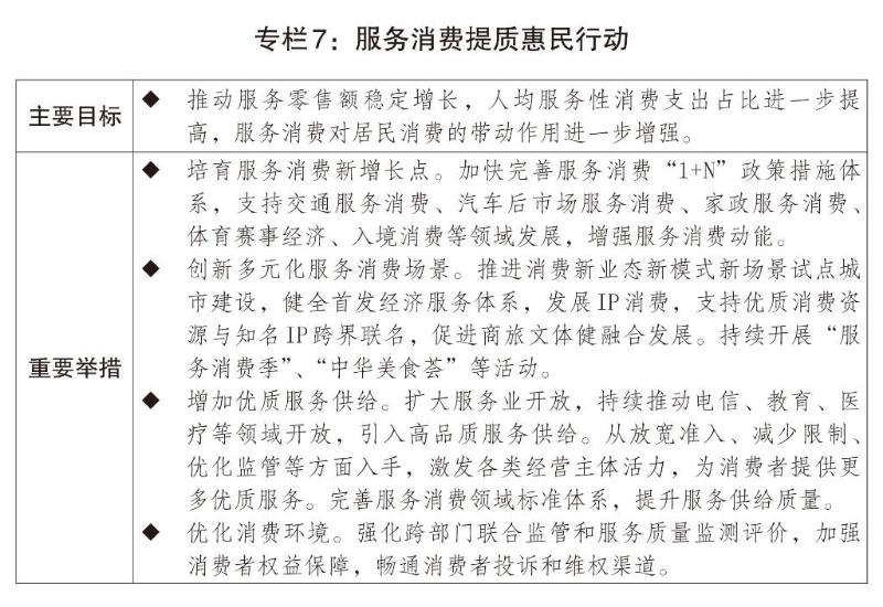 一是推动消费持续增长。深入实施提振消费专项行动。制定实施城乡居民增收计划。完善最低工资标准调整机制,加强最低工资标准国家统筹与分类指导,引导企业构建技能导向的工资分配制度。引导上市公司更加积极开展现金分红、回购注销,增加居民财产性收入。设立1000亿元财政金融协同促内需专项资金,组合运用贷款贴息、融资担保、风险补偿等方式支持扩大内需。扩大优质消费供给,推动商品消费扩容升级,深入实施服务消费提质惠民行动,出台服务消费、首发经济、赛事经济、电子商务、“人工智能+消费”、IP消费等促进政策,大力发展银发经济、冰雪经济,丰富婴童产品、时尚“潮品”、适老化产品、农业精品品牌等,深化线上线下、商旅文体健多业态消费融合,推进消费新业态新模式新场景试点。活跃线下消费,激发下沉市场消费活力。扩大个人消费贷款和服务业经营主体贷款贴息政策支持领域,提高贴息上限,延长实施期限。